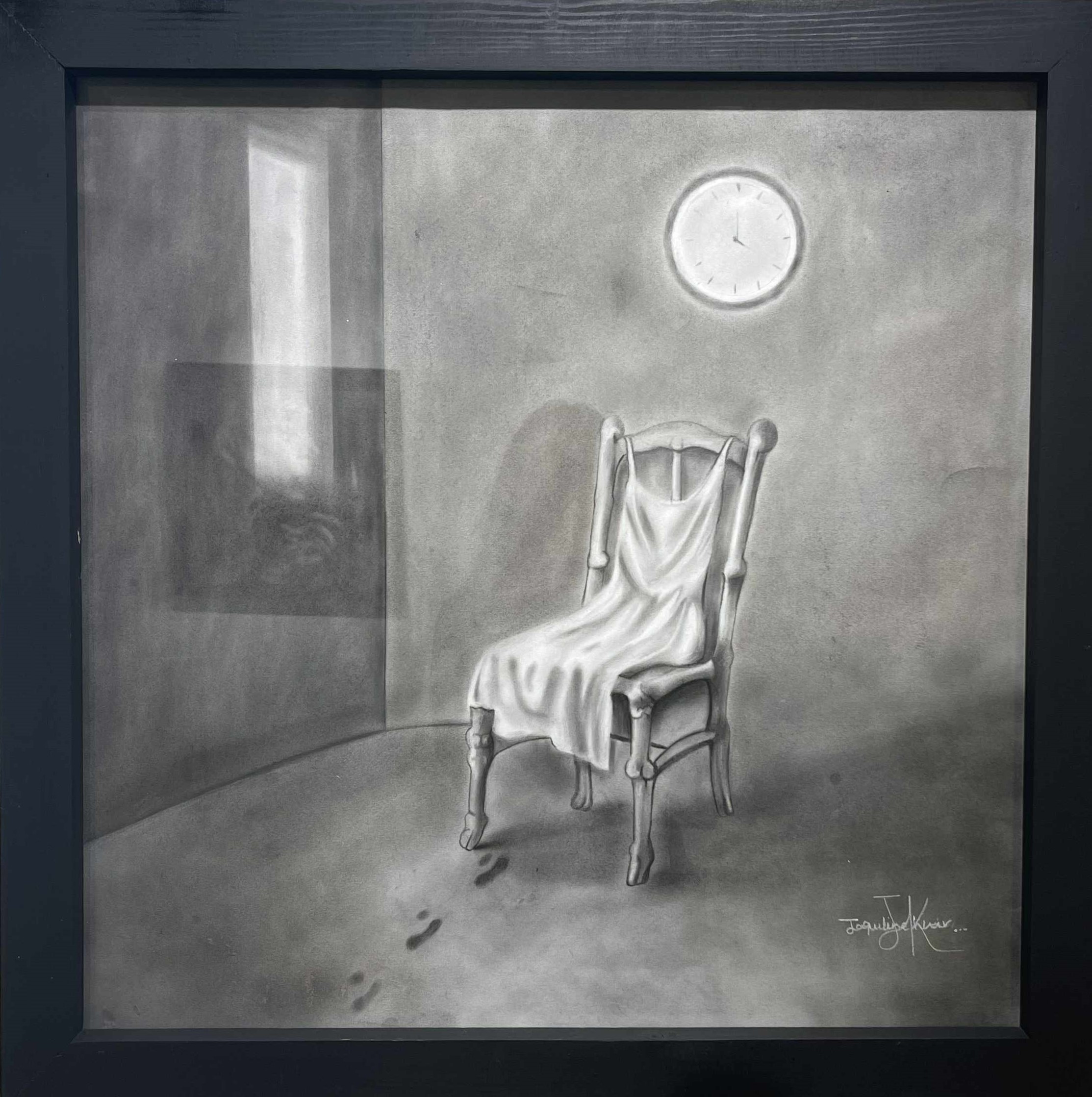 The chair bears witness to someone’s passing. The painting reflects on disappointment in the silence of time and the memory of the place.
