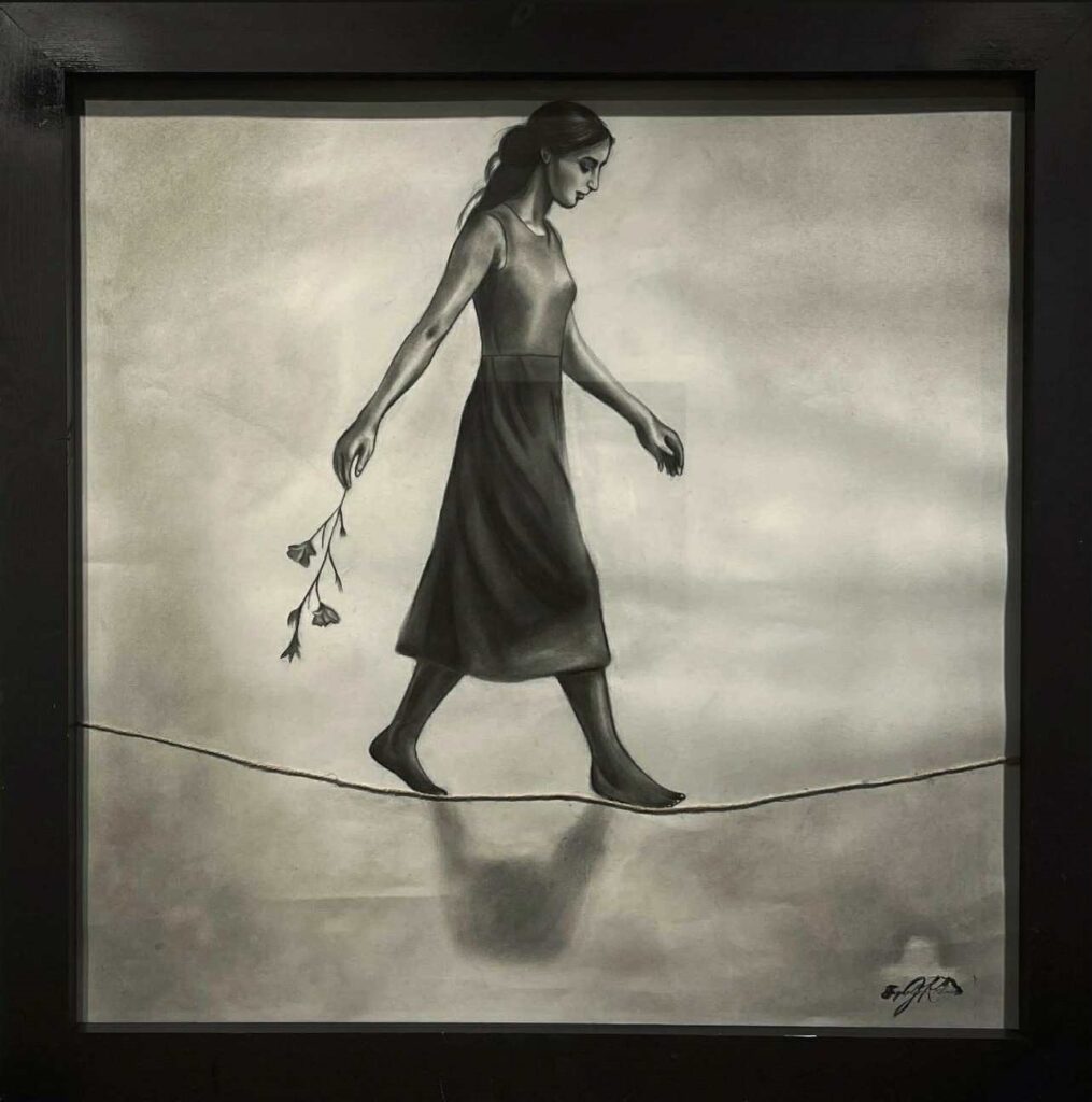Her step is light, as if she does not belong to the earth, yet she remains holding onto a delicate thread that connects her to hope, even if it is fragile.